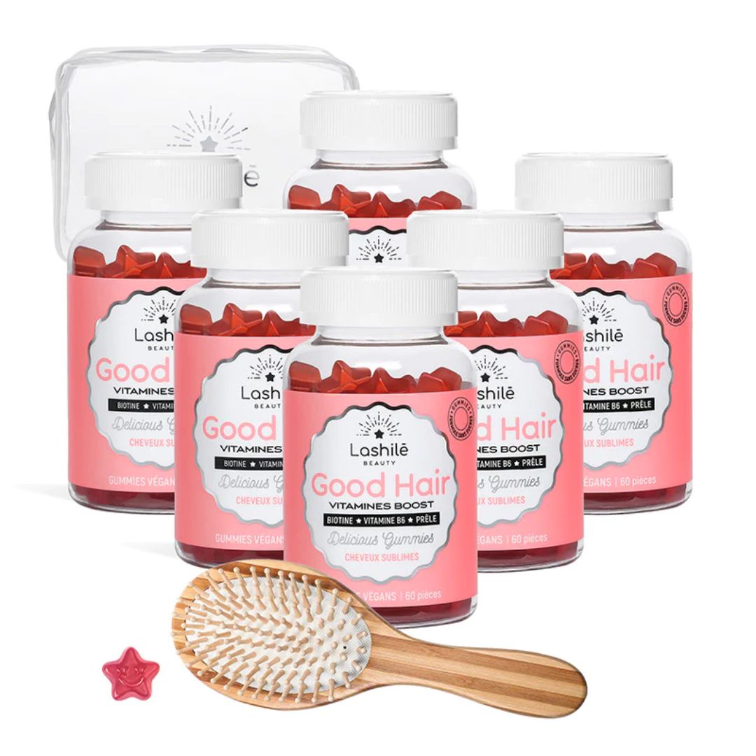Ce pack cadeau exclusif de 6 mois vous permet d'économiser avec notre trousse de toilette et notre brosse en bambou Lashilé Beauty offertes ! (Dans la limite des stocks disponibles).